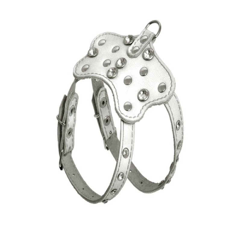 Перламутр :Комплект для декоративних порід прикрашений стразами. Матеріал - шкіра декор; шкіра спилок. Шлейка: Ширина 12 мм, довжина (А) 28-34 см, довжина (У) 38-44 див. Довжина приводу 120смРозмір породи тварин: Дрібні