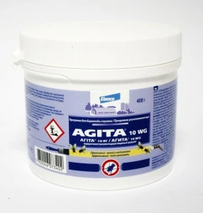 Агіта 10 WG 400 г – високоефективний препарат у гранулах, який застосовується для боротьби з мухами (в т. ч. кровосисних – жигалок), для обробки стін, віконних та дверних отворів, косяків, огорожі. Також препарат використовують для знищення тарганів і бліх, комарів, ос, клопів, мурах, постільних клопів та ін.Склад