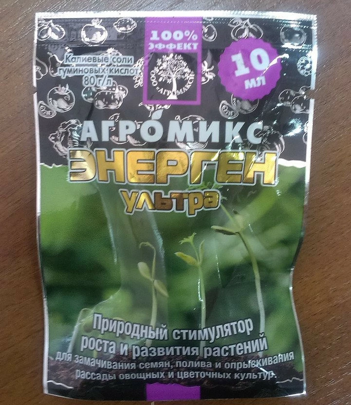 Калієві солі гумінових кислот 80г/л. Препарат володіє наступними властивостями: Підвищує енергію проростання та схожість насіння. Стимулює ріст і розвиток рослин. Захищає рослини від несприятливих факторів, заморозків, засухи і підвищує приживлюваність рослин при пересадці розсади. Знижує вміст нітратів у плодах, нейтралізує радіонукліди та солі важких металів. Підвищує врожайність на 30-40%, збільшуючи вміст вітамінів та інших корисних речовин в овочах, ягодах і плодах. Прискорює дозрівання на 7-10 днів. Культура: Насіння овочевих культур. Дія: підвищує енергію проростання та схожості насіння. Витрата препарату: 5-10 крапель розвести на 50мл води. Витрата робочого розчину: 50мл для обробки 2-10г насіння. Насіння огірків, капусти замочити на 6-10 годин, томати на 4 години. Культура: бульби картоплі на посадку. Дія: підвищує енергію проростання і стимулює схожість. Витрата препарату: 10мл розвести на 0.5 л води. Витрата робочого розчину: обприскування бульб під час яровизації за 2-3 дні перед посадкою. Культура: бульби-цибулини квіткових культур. Дія: підвищує енергію проростання і стимулює схожість. Витрата препарату: 10мл розвести на 0.5 л води. Витрата робочого розчину: обприскування бульб перед посадкою. Культура: Розсада овочевих культур. Дія: підвищує виживаність рослин при пересадці розсади, стимулює ріст і розвиток рослин, захищає рослини від несприятливих факторів, заморозків, засухи. Витрата препарату: для поливу 10мл розвести на 20л води. Для обприскування розсади 10мл на 6л води. Витрата робочого розчину: на 10л 2.5 кв. м; 3л на 100кв.м. Культура: Розсада квіткових культур. Действие: повышает выживаемость растений при пересадке рассады, стимулирует рост и развитие растений, защищает растения от неблагоприятных факторов, заморозков, засухи. Расход препарата: для полива 10мл развести на 20л воды. Для опрыскивания рассады 1.5мл на 10л воды. Расход рабочего раствора: 10л на 2.5 кв.м; 10л на 100кв.м. Препарат практически не опасен для человека, теплокровных животных, рыб, пчел и других полезных насекомых. Не загрязняет окружающей среды. Клас небезпеки 3 (в якості розчинника використовується технічний етиловий спирт з добавкою шампуню для кращої змочуваність поверхні листя). Термін зберігання 3 роки з дати виготовлення.Оплата та доставка
