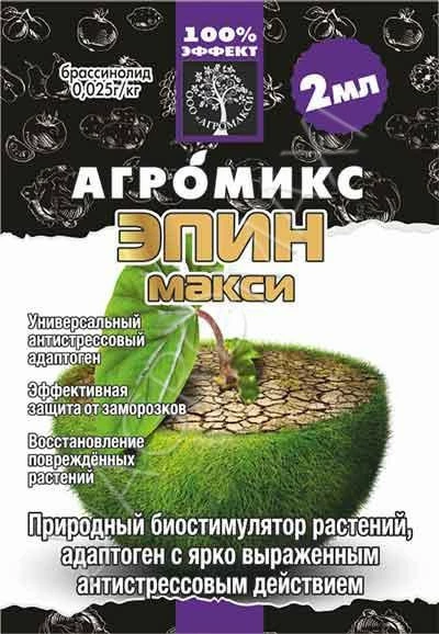 Брассинолид 0.025 г/кг. Природний біостимулятор рослин, адаптоген з яскраво вираженим антистресовою дією. Забезпечує: Прискорене проростання насіння; Прискорення росту розсади при пікіровці та пересадці; Прискорення дозрівання і збільшення врожайності; Захист рослин від заморозків та інших несприятливих умов; Підвищення стійкості до фітофторозу, перроноспорозу, парші, бактеріозу та фузаріозу; Відродження ослаблених і омолоджування старих рослин за рахунок стимуляції бічного пагоноутворення; Зниження в рослині кількості токсинів, важких металів, радіонуклідів, надлишок нітратів. Тому особливо показаний при: Заморозках, Підтоплення, Нашестя шкідників та ін., тобто показаний при будь-яких стресових для рослин ситуаціях, особливо ефективний при завчасній обробки рослин, наприклад перед пересадкою розсади. Використання Епіне-максі: 2 мл (1 ампула) епіне-максі на 10л води 1 ампула - 2 мл або приблизно 80 крапель. Передпосівна і передпосадкова обробка. Насіння овочевих культур замочують у розчині Епіне-максі (1-2 краплі на 100 мл води для томатів, огірків, перців, баклажанів) 18-20 годин при температурі +20С. Насіння квіткових культур 4 краплі епіне-максі на 100мл води на 18-20 годин. Цибулини квіткових культур і живці замочують перед посадкою в розчині Епіне-максі (2мл на 4л води) 24 і 12 годин відповідно. Бульби картоплі обприскують перед посадкою (2мл на 500мл води на 100 кг картоплі). Обприскування вегетуючих рослин 2мл Епіне-максі розчиняють у 10л води і ретельно перемішують. Обприскування проводять рівномірно змочуючи листя. Робочий розчин використовують відразу після приготування. Не допускати лужного середовища. Розсаду-обприскують розчином Епіне-максі (5-6 крапель на 0,5 л води) у фазі 2-3 справжніх листків і напередодні пересадки. Обробка рослин проводиться в такі фази: Картоплю, томати – бутонізація -початок цвітіння; Коренеплоди - по сходам; Огірки – 2-3 справжніх листків з повторенням у фазі бутонізації; Перці – на початку бутонізації з повторенням у фазі цвітіння; Тюльпани – при появі бутонів; Плодово-ягідні – у фазі бутонізації з повторенням через 20 днів; Витрата становить 2-5л розчину на молоде дерево і 5-8л розчину на доросле дерево); При стресових умовах вирощування (недолік світла, заморозок, початок хвороб і т. д.) обприскування проводять кожні 7-10 днів до видужування рослин. Препарат практично не небезпечний для людини, теплокровних тварин, риб, бджіл та інших корисних комах. Не забруднює навколишнього середовища. Клас небезпеки 3 (в якості розчинника використовується технічний етиловий спирт з добавкою шампуню для кращої змочуваності поверхні листя). Термін зберігання 3 роки з дати виготовленняОплата та доставка