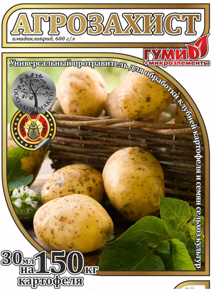 Агрозахист - сучасний протруйник для захисту картоплі від колорадського жука і дротяників.Опис Діюча речовина: імідаклоприд, 600г/л Препаративна форма: концентрат суспензії Призначення та норма витрати Культура Норма витрати Термін дії Спосіб, час обробки Картопля 10мл на 0.6л води на 50кг Личинки хруща , капустянка Замочування бульб картоплі Буряк 10мл на 0.2л води на 1кг Дріт, довгоносики, чорнотілка, комплекс ґрунтових і поверхневих шкідників Замочування насіння Кукурудза Соняшник Пшениця 10мл на 0.5л води на 1кг кукурудзяний жук Замочування насіння Розсада овочевих культур Спектр дії Витратна норма, спосіб, час обробки Капуста Томати Перець Баклажани Колорадський жук, довгоносики, моль, попелиця, дротики, блішки, трипси, капустянка, медведка, комплекс грунтових і поверхневих шкідників 2мл розвести в 1л розсади (200-250 рослин) протягом 6-8 годин. Робочий розчин, що залишився, використовувати для поливу рослин після посадки з розрахунку 20-50мл на рослину Рекомендації щодо застосування Імідаклоприд характеризується гострим контактно-кишковою дією на шкідників сільськогосподарських культур, має виражену системну активність, проникає в проростки і молоді рослини через листя і коріння. Запобіжні заходи Під час роботи категорично забороняється вживати їжу, пити і курити сигарети. Користуватися засобами індивідуального захисту шкірного покриву, очей та органів дихання. Після закінчення робіт прийняти душ і змінити одяг. Перша допомога При потраплянні засобу на шкіру або в очі промити їх чистою проточною водою. При попаданні в шлунок: прополоскати рота, очистити шлунок, прийняти активоване вугілля. Звернутися до лікаря. Умови зберігання Зберігати у неушкодженій упаковці в сухому місці, недоступному для дітей та тварин, окремо від харчових продуктів, при температурі від 0 до +30°С. Класифікація ВООЗ: 3 клас небезпеки. Утилізація Обприскувачі та використані ємності промити водою, промивні води додати кашку хлорного вапна (1кг на 4л води) та злити в компостну яму глибиною не менше 1м. Порожню упаковку утилізувати відповідно до вимог чинного законодавства.
