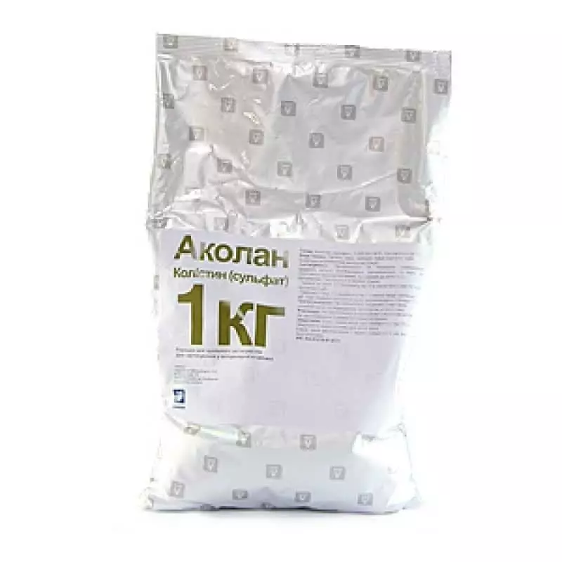 Порошок для орального застосування. Аколан колістин оральний - адаптований для точного дозування. Колістину сульфат - антибактеріальний препарат поліпептидного групи, що діє бактерицидно на грамнегативні бактерії: E. coli, Klebsiella, Salmonella spp., Pasteurella, Bordetella, Pseudomona, Proteus spp., Shigella spp.