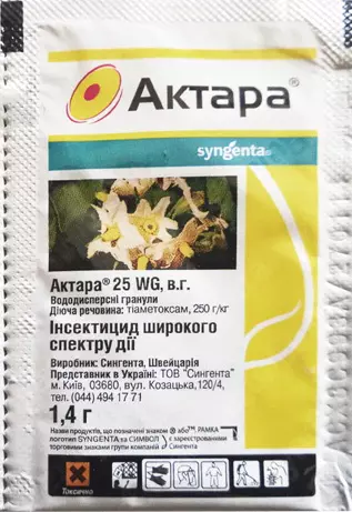 Актара — системний інсектицид нового покоління, має високу ефективність і швидко діє (протягом 15 хвилин) незалежно від погодних умов. Актара® гарантовано захищає рослини протягом 24 днів, що на 6–7 днів довше, ніж інші інсектициди. Актара® захищає також молоді пагони, які з’явилися після обробки, завдяки високій розчинності й рухливості діючої речовини в рослині. Діюча речовина препарату рухається по рослині тільки вгору (апікально) по ксилемі і не накопичується в бульбах, овочах та плодах, які формуються з відливом пластичних мас по флоемі. Препарат належить до класу малотоксичних речовин (ЛД50>5000 мг/кг).Актара® зареєстровано для обприскування рослин, а також для замочування розсади томатів, капусти, солодкого перцю і баклажанів, обробки бульб картоплі перед посадкою.