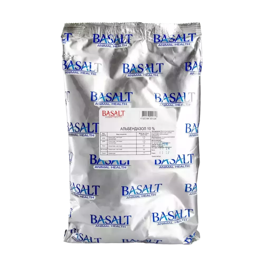 Дозування: Препарат вводять всередину в суміші з кормом. Млекопоглинальним одноразово, птицю — дворазово індивідуально або груповим способом. Великому рогатому скоту для лікування та профілактики сенізіозу, легеневих і шлунково-кишкових нематозів альбендазол 10% згодовують індивідуально в дозі 75 мг/кг, у разі хронічного фасціолізу — у дозі 100 мг/кг маси тварини. Овцям альбендазол 10% призначають індивідуально або груповим способом. Проти монідзів, легеневих і кишкових нематод препарат застосовують у дозі 50 мг/кг маси тварини. У разі хронічного фасціолізу альбендазол застосовують у дозі 75 мг/кг, проти хронічного дикроцеліозу — у дозі 150 мг/кг маси тварини. Свинячий для лікування та профілактики аскаридозу й езофагостомозу альбендазол 10% призначають у ранкове годування — з концентрованими кормами. Препарат відвішують із розрахунку 100 мг/кг маси. Коняшам у разі параскаридозу та стронгілоідозу, а також у разі змішаної інвазії, альбендазол 10% призначають індивідуально, одноразово з кормом у дозі 70 мг/кг маси тварини. Пташице в разі аскаридіозу, гетеракідозу та змішаної інвазії альбендазол призначають груповим способом у суміші з комбікорм у дозі 100 мг/кг маси птиці, два дні поспіль у ранкове годування.