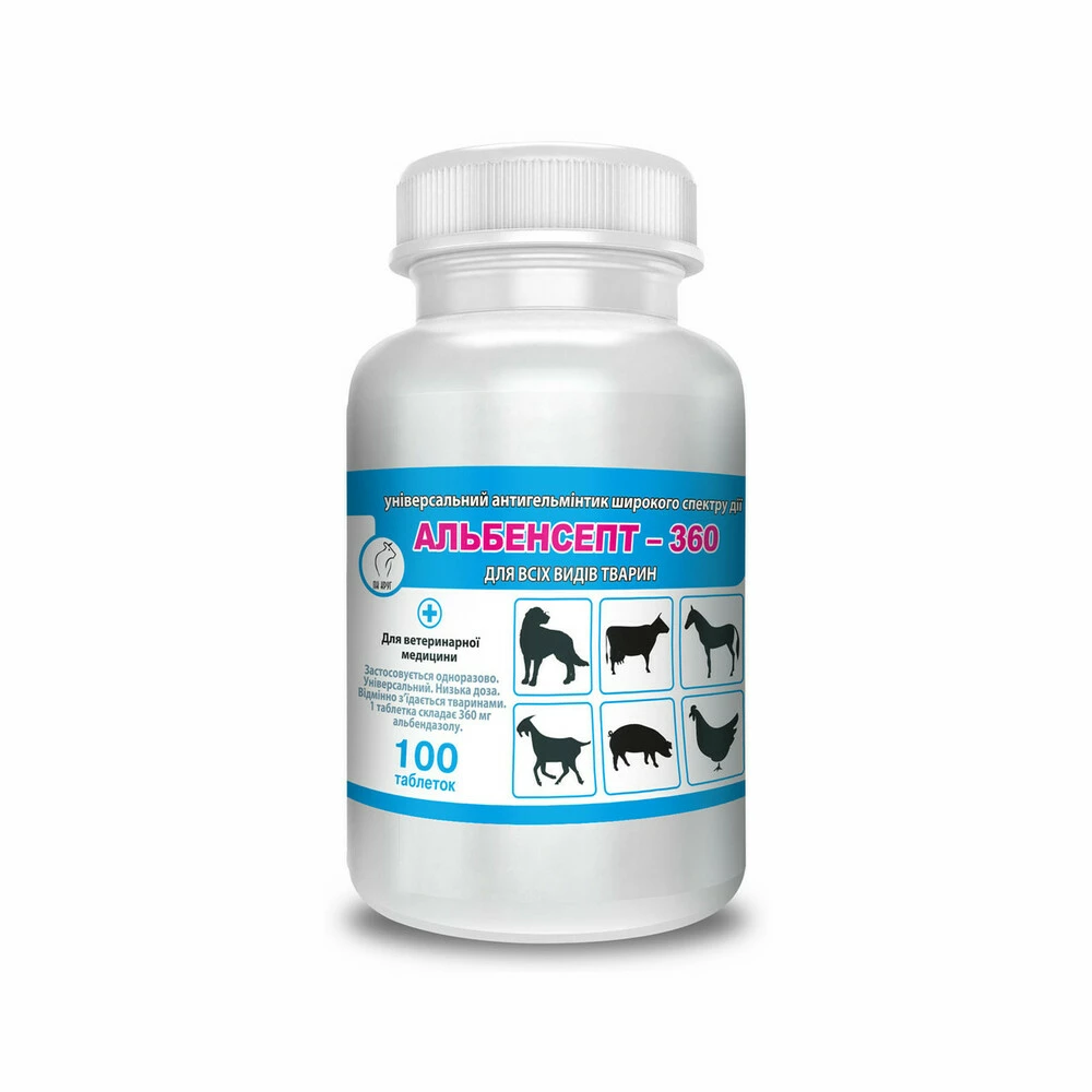 ДОЗУВАННЯ Перорально, одноразово при груповій або індивідуальній дегельмінтизації разом із кормом у наступних дозах: собаки – 1 пігулка на 15 кг ваги; велика рогата худоба – 1 таблетка на 50 кг ваги; коні – 1 таблетка на 50 кг ваги; кози, вівці – 1 пігулка на 70 кг ваги; свині – 1 таблетка на 35 кг ваги; птах – 1 таблетка (подрібнена) на 35 кг ваги. ЗАСТЕРЕЖЕННЯ Після прийому таблеток Альбенсепта-360 м'ясо тварин не допускається використовувати для харчових цілей протягом 14 днів, а молоко та яйця протягом 4 днів. ФОРМА ВИПУСКУ Полімерна банка, 100 пігулок. УМОВИ ЗБЕРІГАННЯ Зберігати у сухому прохолодному місці окремо від харчових продуктів, напоїв, корму для тварин, у недоступному для дітей місці при температурі від 5 до 25 °С. ТЕРМІН ПРИДАТНОСТІ 2 роки від дати виготовлення.