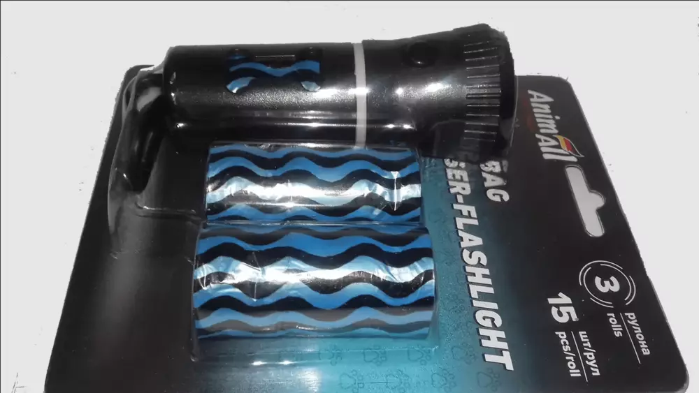 Комплект диспенсер-led-ліхтарик на карабіні зі змінними пакетами для прибирання за собакою Animall (3 рулони по 15 пакетів).