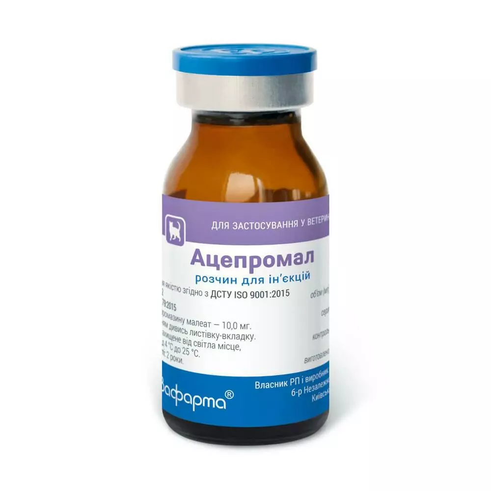 Ацепромазину малеат – нейролептик групи фенотіазинів, препаратів седативного спрямування. Використання його у вигляді 1% ін'єкційного розчину забезпечує прояв заспокійливої та міорелаксантної дії шляхом зниження збудження центральної нервової системи. У той же час препарат виявляє гіпотермічну, гіпотензивну, антигістамінну, адренолітичну, спазмолітичну, протиблювотну дію, прискорює та посилює дію снодійних та місцево анестезуючих засобів.