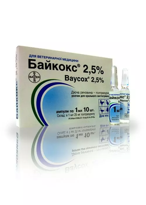 Байкокс 2,5%, ампула 1 мл суспензія для орального застосування жовтуватого кольору. Антикокцидійний лікарський засіб, призначений для профілактики та лікування кокцидіозу у сільськогосподарської птиці (індички, кури, гуси тощо).Фармакологічні властивості