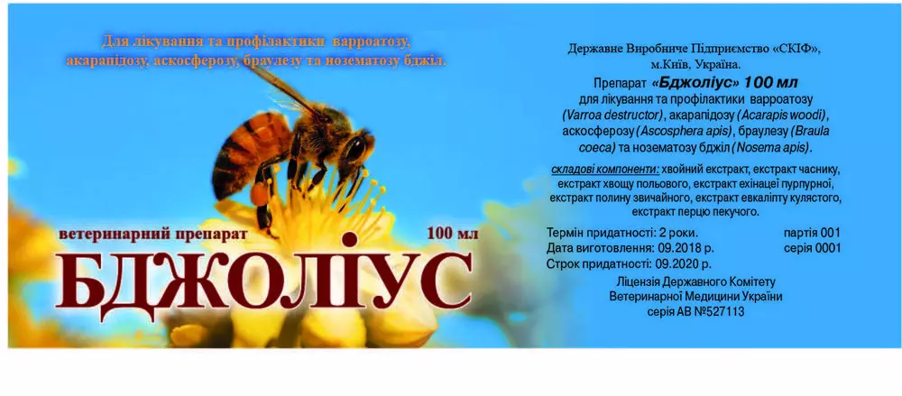 Фармакологічна дія: препарат «Бджоліус» проявляє білі-виражену бактерицидну, фунгіцидну, акарицидну та протипротозойну дію. Висока активність препарату «Бджоліус» визначається сумарною дією складного комплексу біологічно-активних речовин, макро - елементів та мікро-елементів, що входять до його складу.Форма випуску: флакон об'єднання об'ємом 100 мл, що містить екстракт від темно-жовтого до світло-коричневого кольору з хвойним запахом, має гіркій пекучий смак.