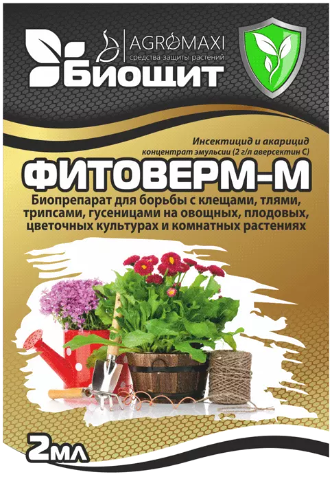 "Биощит "Фітоверм-М" має широкий спектр дії проти понад 20 видів комах шкідників, в тому числі колорадського жука, капустяної білянки, капустяної совки, павутинного кліща, яблуневої плодожерки, цвітоїдів, трипсів, всіх видів попелиці і т. д. Широкі випробування "Фітоверм-М" проводили спеціалісти захисту рослин. Спостереження показали, що він знижує чисельність листогризучих шкідників на яблуні і чорній смородині на 94-100%. Проти кліщів на яблуні і чорній смородині ефективність "Фітоверм-М" становить 96-100%. Він викликав 100% загибель жуків почковых довгоносиків і на 75-85% пригнічував розвиток яблуневої попелиці і смородинової верхівкової попелиці. Дворазове застосування "Фітоверм-М" на чорній смородині — відразу після цвітіння і за два тижні до початку дозрівання ягід дозволило повністю запобігти шкодочинність чотириденного листового кліща та листовійок, на 86% — смородинової верхівкової попелиці. Він не забруднює навколишнє середовище, швидко руйнується у воді і ґрунті. Термін очікування від останньої обробки до збирання врожаю — не більше 3-х діб. Добре діє навіть в жарку погоду на відміну від багатьох традиційних препаратів.Приготування робочого розчину: налити у відро 1-2 л води, розкрити ампулу чи відміряти дозатором певну кількість препарату (згідно з таблицею) і вилити у відро з водою і ретельно перемішати, потім довести розчин до необхідного об'єму 10 л і перемішати ще раз.