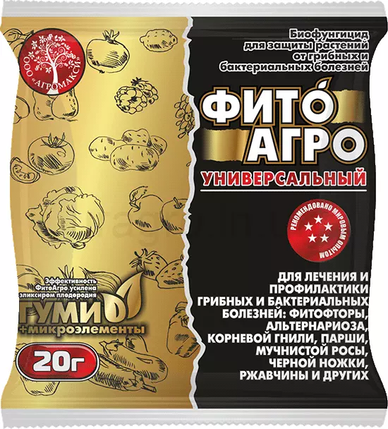"ФитоАгро" - мікробіологічний препарат призначений для захисту городніх, садових, кімнатних і оранжерейних рослин від комплексу грибних і бактеріальних хвороб (фітофторозу, кореневої гнилі, парші, борошнистої роси, чорної ніжки, іржі, альтернаріозу, фузаріозу та ін) Крім захисної та профілактичної функції, володіє імуностимулюючим і антистресовими властивостями, посилює захисні функції рослин при несприятливих чинників довкілля (різкі перепади температур, заморозки, посуха та ін.) Немає терміну очікування (продукцію можна вживати в їжу в день обробки).Оплата та доставка