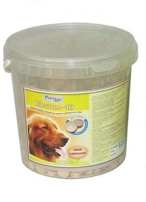 Висококалорійний джерело білка, вітамінів і мінералів "Біостим - 40" розроблений Технологічним інститутом молока і м'яса Української Академії Аграрних наук. Цей препарат створювався як натуральний повноцінний білковий концентрат для собак з лікувально-профілактичним ефектом з натуральних харчових інгредієнтів. Саме наявність натуральних компонентів виділяє його серед безлічі подібних товарів і, протягом останніх 10 років, дозволяє лідирувати серед аналогічних білкових вітамінно-мінеральних добавок.Збалансований склад з натуральних компонентів включає в себе: білки тваринного походження - сухе знежирене молоко, білки рослинного походження - соєвий ізолят, біологічно активні компоненти - ячменно-солодовий екстракт, метіонін, вітаміни і мінерали.