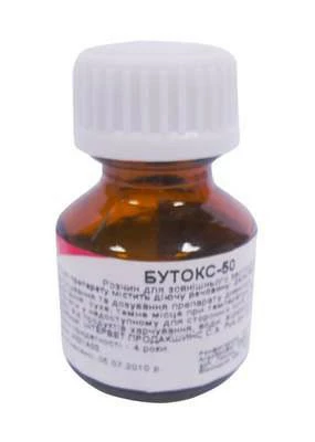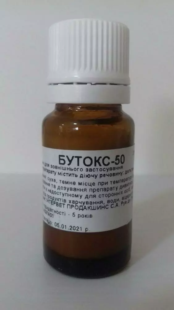 Бутокс, 10 мл - ветеринарний препарат для боротьби з ектопаразитами: іксодові, коростяні кліщі, воші, власоєди, мухи, гілки, клопи, мошки та ін. Застосовують у формі водної емульсії методом обприскування або купання тварин.Склад і форма