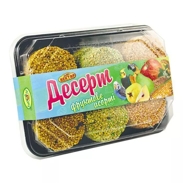 Десерт для птахів Фруктовий (12 шт) - зернові ласощі для птахів необхідні для доповнення та урізноманітнення раціону пернатих. Додатки у формі крекерів дають можливість птаху, відлущуючи зернятка, реалізовувати інстинктивну потребу добувати собі поживу наче у природніх умовах. До того ж, для них – це справжня гра, яка подарує пернатому неймовірний смак та користь для організму вцілому.Склад