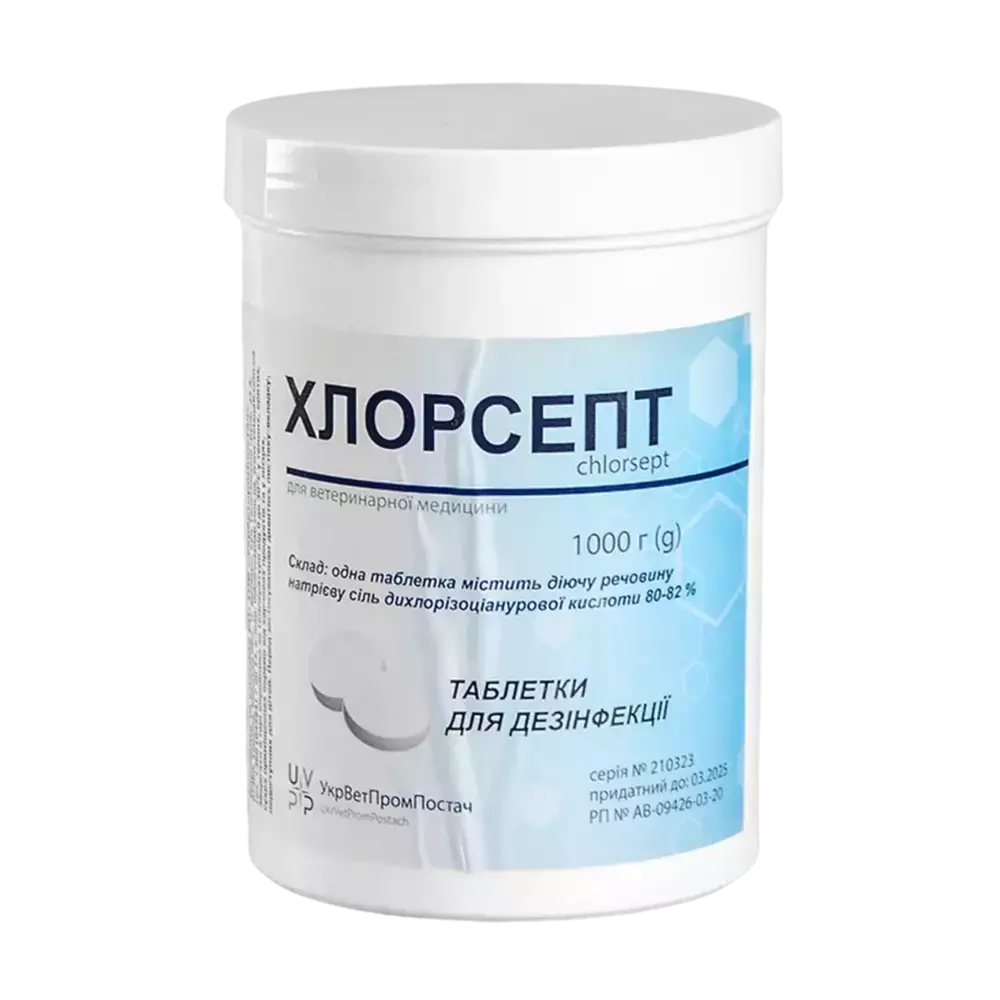 Загальної (профілактичної та поточної) і заключної дезінфекції поверхонь в приміщеннях (підлога, стіни, двері, включаючи поліровані і дерев'яні меблі); Дезінфекції санітарно-технічного (душові приміщення, ванни, раковини, унітази, басейни) та іншого обладнання (медичного, виробничого і т.п.); Предметів догляду за хворими, білизни, посуду, засобів прибирання; Для дезінфекції поверхонь, приміщень на підприємствах, заводах, фабриках, у закладах громадського харчування, медичних, навчальних закладах тощо; Для використання в тваринницьких, с/г підприємствах, птахофермах і т. п.; Дезінфекція колодязів, знезараження води з децентралізованих джерел (в тому числі вода в колодязях). ОСНОВНІ ПЕРЕВАГИ ЗАСОБУ «Хлорсепт»: 1. УНІВЕРСАЛЬНИЙ по спектру антимікробної дії та ЕФЕКТИВНИЙ в боротьбі з інфекціями всіх видів (бактерії, віруси, грибки). Одна таблетка може замінити від 10 до 500 г (мл) порошку (концентрату). 2. ПРОСТИЙ і ЗРУЧНИЙ в застосуванні. Не вимагає використання ваг, мірок і інших дозувальних ємностей. Таблетка швидко і повністю розчиняється у воді без дотримання спеціальних температурних режимів і без розмішування. 3. ЕКОНОМІЧНИЙ завдяки точності дозування. 4. БЕЗПЕЧНИЙ - для людей і навколишнього середовища, не має різкого неприємного запаху, не вимагає використання індивідуальних засобів захисту. 5. СТАБІЛЬНИЙ - не потребує особливих умов зберігання і не втрачає своїх властивостей під час зберігання. 6. КОМПАКТНИЙ - завдяки високій ефективності та низькій нормі витрат вимагає значно менше місця для зберігання, ніж порошки і концентрати. Приготування робочих розчинів проводиться з розрахунку 1 таблетка на 100 м² поверхні або 1 табл. на 10 л води. Приготування робочих розчинів Необхідна кількість таблеток на 10 л води Концентрація розчинів засобу (за активним хлором), % % к-ть табл. 0,015 1 0,030 2 0,045 3 0,060 4 0,100 7 0,200 14 0,300 20 Засіб розфасовано в полімерні ємності місткістю 1 кг (приблизно 300 таблеток). Термін зберігання робочих розчинів не більше 3 діб. Термін придатності - 2 роки.Оплата та доставка