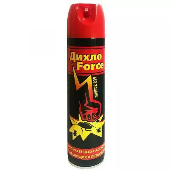 Ефективний інсектицидний універсальний засіб побутового призначення "Дихло Force" 300 мл без запаху широкого спектру дії застосовується проти всіх відомих комах. Цей дихлофос має 3 діючі компоненти. Характеризується короткочасним терміном дії з високою початковою токсичністю для кліщів, попелиць, молодих личинок та дорослих особин лускокрилих та мух, виявляє овіцидну дію (вплив на личинки-яйця мух та вошей).