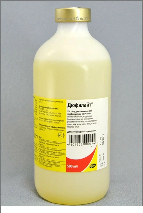 Дуфалайт (Duphalyte) для профілактики та лікування гіповітамінозів, порушень білкового обміну, підвищення резистентності сільськогосподарських тварин, у тому числі птахів, а також кішок та собакСклад