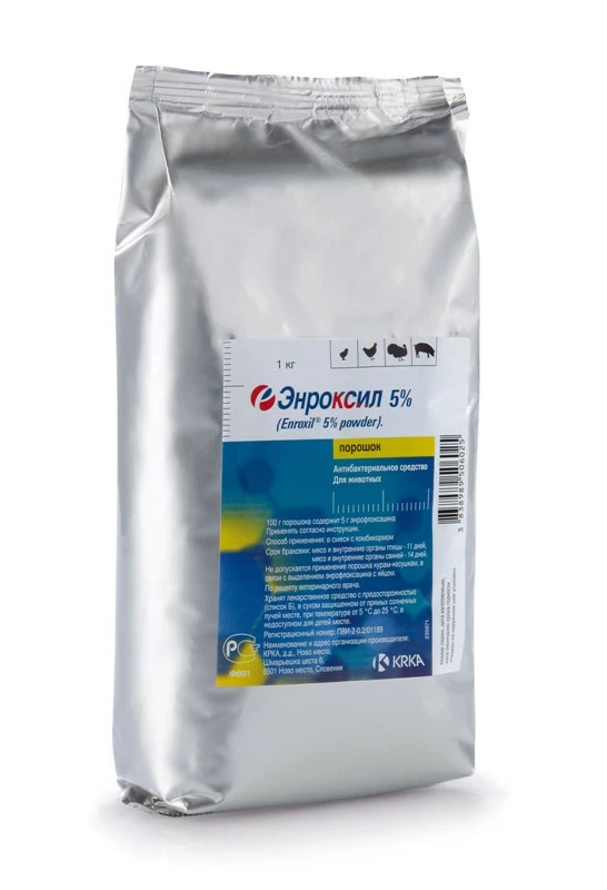 - свиням - 2,5 мг/кг живої ваги, що відповідає 1,5 кг Энроксила 5% порошку на 1 тонну корму; при сальмонельозі і у важких випадках захворювання дозу препарату збільшують у два рази (5 мг/кг живої ваги, або 3 кг Енроксилу 5% порошку на 1 тонну корму);