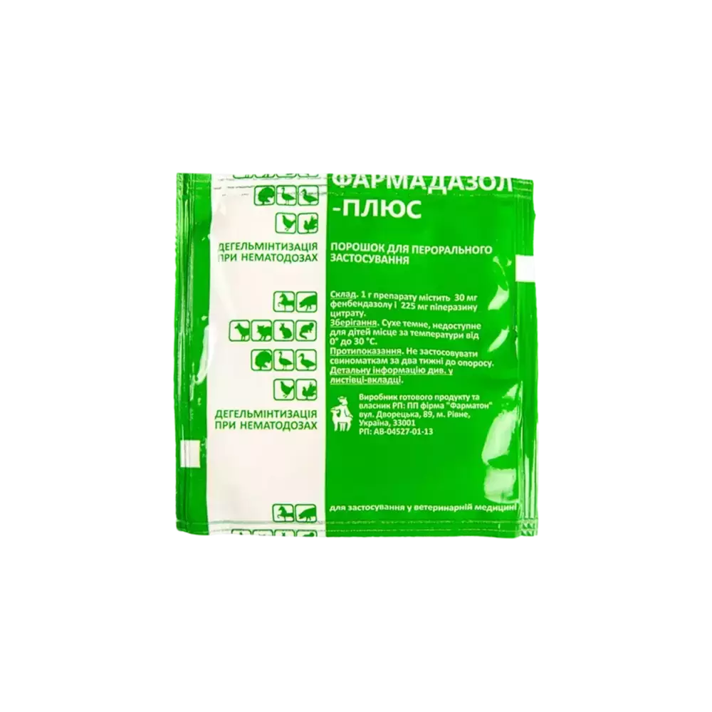 Опис Порошок сірувато–білого кольору без запаху. Склад 1 г препарату містить діючі речовини: фенбендазол – 30 мг; піперазину цитрат –225 мг. Допоміжні речовини: кальцію карбонат, лактоза. Фармакологічні властивості АТСvet класифікаційний код QР52А, протитрематодні, протинематодні і протицестодні ветеринарні препарати (QР52АС13, фенбендазол) Фармадазол-плюс – антигельмінтний препарат, дія якого зумовлена вмістом фенбендазолу та піперазину цитрату, він ефективний відносно нематод: у свиней (Ascaris suum, Oesophagostomum spp., Strongyloides ransomi(статевозрілі), Trichuris suіs, Trichocephalus suis, Hyostrongylus rubidus, Metastrongуlus spp.; Ollulanus tricuspis,Physocephalus sexalatus), у коней (Parascaris equorum, Oxyurіs equi, Strongyloides westeri, Strogylus vulgaris,Strongylus equinus та Strongylus edentatus), у м’ясоїдних та хутрових звірів(собаки,коти,лиси,песці)(Ancylostoma caninum, Toxocara canis, Тохосага mystax, Toxascaris leonina, Uncinaria stenocephala, Trichinellaspiralis), у кролів (Passalurus ambiguus), у птиці(кури,індики,перепели,голуби) (Ascaridia spp., Capillariaanseris, Heterakis gallinarum, Heterakis isoloche, Tetrameres fissispina, Syngamus trachea), у водоплавної птиці(гуси,качки) (Amidostomum anseris, Syngamus trachea, Tetrameres spp., Ganguleterakis dispar, Hymenolepisgracilis, H. paracompressa). Фенбендазол належить до групи бензимідазолів, він згубно діє на личинковi форми, зрiлих паразитiв та їх яйця внаслідок порушення біохімічних процесів і енергетичного обміну в клітинах гельмінтів. Піперазин зумовлює параліч гангліозних клітин кишкових нематод, які надалі під впливом перистальтики виводяться з кишечника тварини. Сумісна дія фенбендазолу і піперазину адипінату розширює діапазон антигельмінтної дії препарату і не потребує збільшення дози при змішаних гельмінтозах. Застосування Дегельмінтизація свиней, коней, м’ясоїдних та хутрових звірів (собаки, коти, лиси, песці), кролів і птиці (кури, індики, перепели, голуби, гуси, качки) при нематодозах. Дозування Перорально при вранішній годівлі індивідуально або груповим методом у суміші з кормом (дерть, м’ясний або рибний фарш) у дозах: Вид тварин Вид гельмінтозу Доза препарату, грам на 10 кг маси тіла Термін лікування Свині Аскароз, трихоцефальоз, езофагостомоз, метастронгільоз, стронгілоїдоз, хіостронгільоз 1,5 Дві доби підряд Оллюляноз, фізоцефальоз 3 Два рази через добу Поросята від 1 до 4 міс. З профілактичною метою 0,4-0,5 Один раз щотижня Коні Параскаридоз, оксиуроз, стронгільоз, стронгілоїдоз 1,5-2 Одноразово Лошата від 1 до 6 міс. Змішана інвазія 1 Дві доби підряд Собаки, коти та хутрові звірі Токсокароз, токсаскаридоз, унцинаріоз, стронгілоїдоз, анкілостомоз 8-10 Три доби підряд Кролі Пасалуроз, простронгільоз, трихостронгільоз, трихоцефальоз 5 Одноразово Кури Аскаридіоз, гетеракідоз, капіляріоз 1,5 Дві доби підряд Сінгамоз 2 Дві доби підряд Водоплавна птиця Амідостомоз, тетрамероз, гангулотеракідоз 2,0-2,5 Одноразово Гіменолепідіоз, нотокотілідоз 7,5-8 Дві доби підряд Голуби Аскаридіоз, капіляріоз 1 г/голову Три доби підряд При додаванні препарату в корм його змішують з 1/3 частиною запланованої до згодовування порції корму, із вологими мішанками – змішують з сухим кормом, після чого додають воду. Коням і лошатам препарат задають з дертю індивідуально у відрах, при цьому суміш ретельно перемішують і змочують водою. Протипоказання Не застосовувати свиноматкам за два тижні до опоросу. Застереження При груповій обробці спочатку обробляють препаратом декількох тварин. За відсутності ускладнень обробляють решту тварин. Забій тварин і птиці після дегельмінтизац