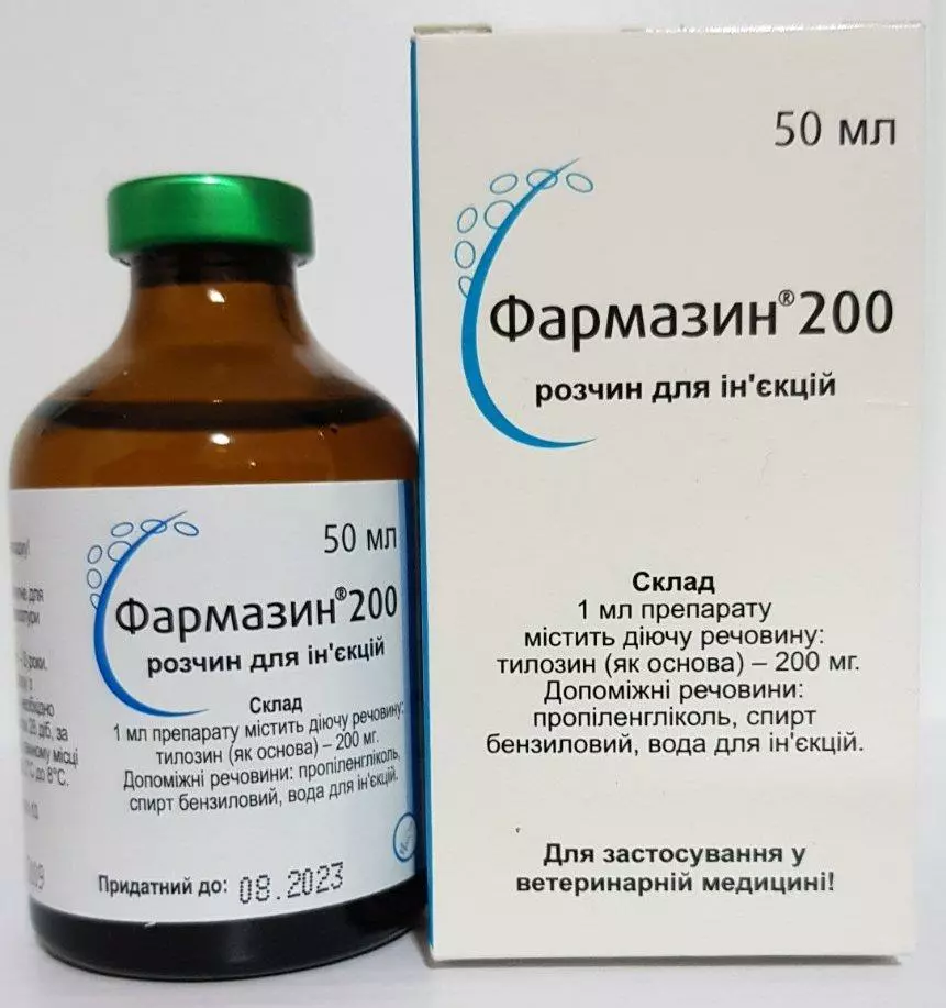 Фармазин 200 — лікарський препарат, що містить в якості активнодіючого речовини антибіотик тилозин у формі підстави в органічному розчиннику. Фармазин 200 містить 200 мг тілозизу в 1 мл Препарат являє собою ін'єкційний розчин світло-жовтого кольору. Випускають у флаконах по 50 мл, які вкладають у картонні коробки.ФАРМАКОЛОГІЧНІ ВЛАСТИВОСТІ