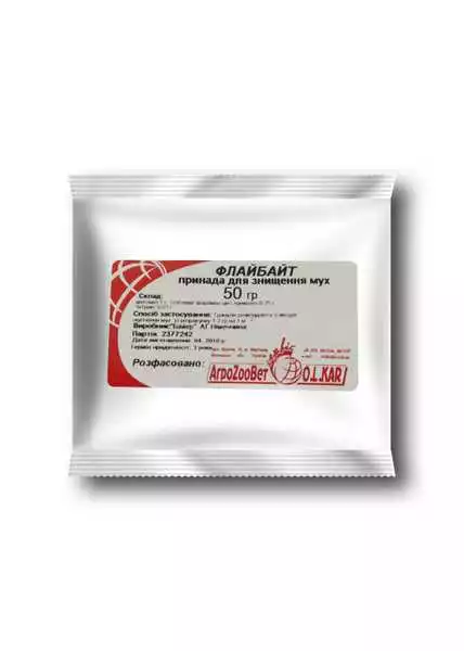 СкладПрепарат являє собою дрібні гранули жовтого кольору. В якості діючої речовини Флай Байт містить метомил в кількості 1 %, що викликає інсектицидний ефект; мускалюр (9-цис-трикозен) (0,25 %) – статевий феромон мух – забезпечує залучення комах до гранулам, а наявність у складі цукру сприяє охотного поїдання їх мухами, що дозволяє вважати гранули харчової приманкою. Наявність горького компонента битрекса (0,01 %) захищає її від поїдання птахами і тваринами.