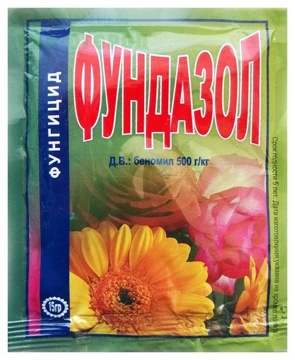 Фундазол - фунгіцид та протруйник з широким спектром дії проти великої кількості грибних хвороб: борошниста роса, бура плямистість, парша, сіра і коренева гнилі, оїдіум, антракноз, бактеріоз, фузаріоз, кила, які знищують насіння і листя рослин.Діюча речовина: беномілу