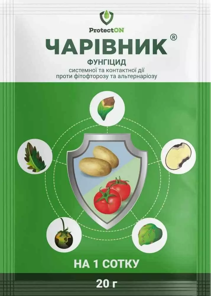 Фунгіцид Чарівник, що має контактні та системні властивості, використовується для обробки посівів різних агрокультур з метою запобігання та лікування грибкових захворювань. У складі даного препарату знаходяться три активні компоненти: металаксил, манкоцеб та диметоморф, кожен з яких належить до різних хімічних категорій, визначаючи їх різноманітні способи взаємодії з патогенами. Металаксил виступає в ролі системного фунгіциду, демонструючи захисні та лікувальні якості, особливо щодо несправжніх борошнисторосяних грибів і кореневих гнилей. Даний компонент проникає в рослину, розподіляючись по всіх її частинах. Манкоцеб діє як контактний фунгіцид, забезпечуючи захист поверхні рослини, не проникаючи у його внутрішні шари. Він не дозволяє патогенам проникати всередину і, навіть якщо вони все ж таки потраплять на рослину, манкоцеб пригнічує їх активність, порушуючи їх життєво необхідні процеси та запобігаючи поширенню. Диметоморф, маючи системні характеристики, ефективний проти ооміцетів, особливо проти збудників мілд'ю винограду та фітофтори на томатах та картоплі. Він викликає ефект, що перешкоджає формуванню спор. Три компоненти у складі Чарівника взаємодіють синергічно, запобігаючи можливому розвитку стійкості патогенів до препарату. Захисні властивості препарату зберігаються до двох тижнів. Фунгіцид Чарівник ефективно застосовують для захисту картоплі, томатів, винограду, огірків, цибулі, ріпаку та інших агрокультур проти фітофторозу, мілдью, альтернаріозу, пероноспорозу, та багатьох інших захворювань.