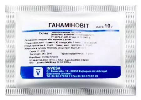 СкладДрібний кремовий порошок для внутрішнього прийому у складі: ретинолом (віт.- А) 10 000 МО; токоферолом (віт.-Е) 10 мг; колекальциферолом (віт. - D3) 1000 МО; менадіоном (віт. - К3) 1.5 мг; аскорбінової до-тої (віт.-С) 25.5 мг; тіаміном (віт.- В1) 2 мг; рибофлавіном (віт. - B2) 4 мг; кальцію пантотенатом (віт. - В5) 10 мг; піридоксином (віт. B6) 1.5 мг; фолієвої до-тої (віт. Bc) 500 мг; нікотинамідом (віт.-PP) 20 мг; біотином (віт.-Н) 15 мг; метіоніном 50 мг; лізином 50 мг; аланіном 13 мг; аргініном 15.5 мг; аспарагінової до-тої 28 мг; валіном 27.5 мг; гістидином 11.8 мг; гліцином 5 мг; глутамінової кислоти 35 мг; ізолейцином 23 мг; лейцин 35 мг; проліном 39 мг; серином 24 мг; треоніном 18.5 мг; триптофаном 6.5 мг; цистином 1.9 мг; фенілаланін 19 мг.