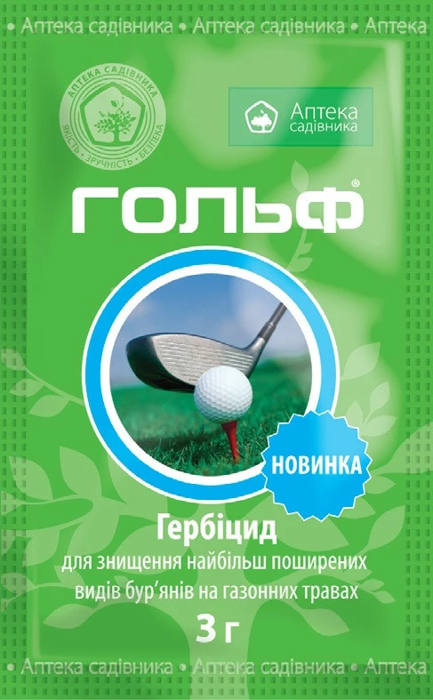 Препарат Гольф – гербіцид післясходової, системного селективного дії, який застосовується для боротьби з найвідомішими і складні однорічними і багаторічними бур'янами в посівах злакових газонних. Купити гербіцид Гольф в Україні за найнижчою ціною з доставкою в будь-яке місто, ви можете в нашому інтернет-магазині. Гербіцид Гольф ефективний для знищення таких бур'янів: амброзія, волошка синій, гірчиця польова, жовтець, грицики, вероніка персидська, полин, редька дика, рутка, кульбаба, спориш, мак, всі види осоту, чортополох, підмаренник чіпкий, талабан, паслін чорний, гірчак, щириця, падалиця соняшнику та інших бур'янистих рослин. Застосування гербіциду Гольф. Для обробки 120-150 квадратних метрів ділянки готується розчин з 3 г препарату, розведених в 4-5 літрах води. Обприскування проводити в період вегетації. Обприскувати скошену траву. Після обробки газону не косити траву протягом трьох днів. Препарат не представляє небезпеки для нових посівів і повністю розпадається в землі протягом місяця.Оплата та доставка