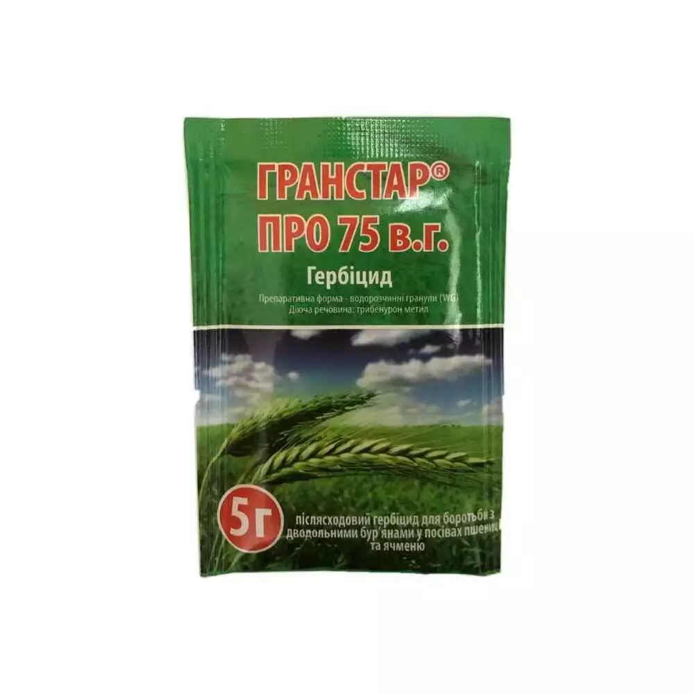 Гранстар Про 75 в.г. застосовується для захисту сходів пшениці, ячменю, жита від бур'янів.Норма витрати: Пакет 5г розчинити в 40 літрах води і на 20 соток.