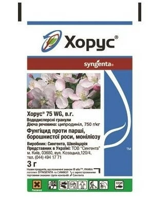 Хорус 75 WG в. г. — надзвичайно ефективний з унікальним механізмом дії фунгіцид проти збудників таких хвороб, як парша, борошниста роса, моніліоз. Крім того, препарат надійно діє при низьких температурах (+5°С), має трансламінарну і контактну дії. Останнє обприскування перед збиранням врожаю суттєво покращує лежкість плодів у сховищах. Знижує втрати від гнилей на 30-40 %. Хорус® 75 WG в. г. надзвичайно ефективний проти моніліального опіку кісточкових (вишня, абрикос, слива, алича, черешня) та кучерявості листя персика. Препарат має високу ефективність проти різних видів гнилей плодів, ягід і винограду. Лікувальна дія — 2 доби, захисна — 10-12 днів. Безпечний для бджіл, корисних комах і довкілля. Належить до малотоксичних препаратів (ЛД50 > 2000 мг/кг). Застосування препарату у фазі розпукування бруньок і рожевого бутона гарантує високу ефективність наступних фунгіцидних обробок.Максимальна кількість обробок за сезон: