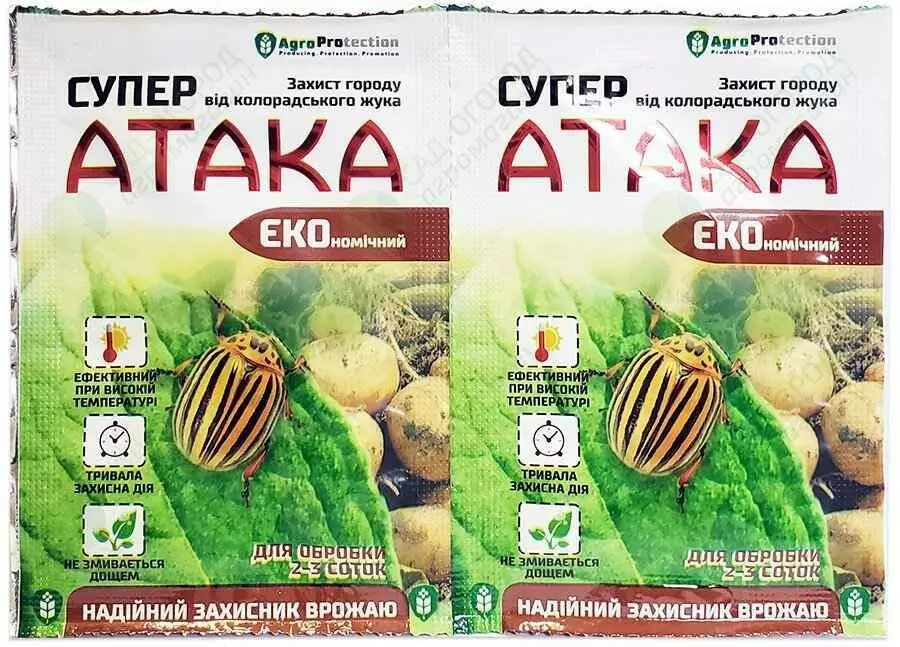 вміст пакету Супер АТАКА – 4 мл, ретельно перемішати. Достатньо для обробки 2-3 соток.