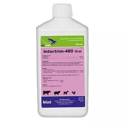 У період застосування Інтертрим – 480 ® тваринам не можна давати препарати, що легко відщеплюють сірку (глауберової сіль та ін), аміноглікозиди (гентаміцин, неоміцин), а також міорелаксанти та анестетики через загрозу розвитку паралічу дихальних м'язів.