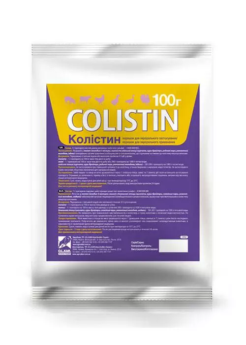 Лікування телят (молодше 3 місяців), свиней та свійської птиці (кури-бройлери, курчата, сімейні пари, ремонтний молодняк, індики) при захворюваннях травного тракту (колибацильозах і сальмонельозах), спричинених мікроорганізмами, чутливими до колистину.