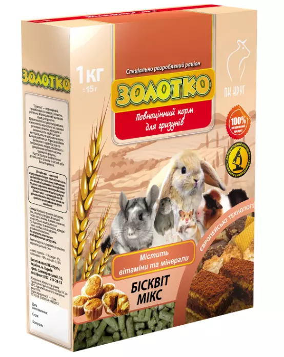 Корм "Золотко. Бісквіт-Мікс" - найкращий спосіб урізноманітнити звичайне меню та зробити життя Вашого улюбленця солодким! Високоякісні вуглеводи та яєчний білок бісквіта сприяють життєрадісному та здоровому життю вашого улюбленця.