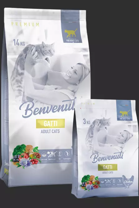 Сухий корм для котів Benvenuti Gatti - cухий преміум-раціон містить м’ясні інгредієнти на першому місці у складі, у тому числі 29% з курки. Комплекс ненасичених жирних кислот Омега 3 + Омега 6 підтримує шкіру здоровою, а шерсть блискучою. Раціон збагачений міксом Овочів, Фруктів і Трав для загальної підтримки здоров’я та імунітету улюбленця.Переваги