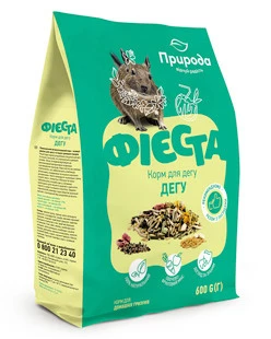 Фієста «Дегу» (PR241378) - повноцінний вітамінізований корм – основний раціон для дегу та інших домашніх гризунів. Рецептура корму розроблена спеціально для дегу та інших гризунів, які утримуються в домашніх умовах. Вона складена у відповідності до рекомендацій ветеринарів та фахівців з розведення гризунів. Корм містить всі необхідні компоненти, які забезпечують улюбленців вітамінами, мінералами та іншими корисними речовинами. Квіти календули та ромашки, гречка, сушені овочі, пелюстки гібіскуса та горіхи забезпечують потреби дегу у вітамінах, необхідних для міцного здоров’я і довголіття, гарного хутра та міцного імунітету. Завдяки герметичній упаковці корм зберігає приємний аромат і захищений від шкідливої дії вологи.Склад