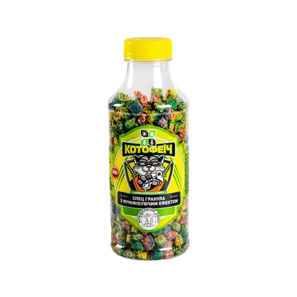 Отрути, що входять до складу, від гризунів Котофеїч муміфікуючі речовини, що входять до складу отрути від гризунів Котофеїч, не дозволяють трупам шкідників розкладатися. Це дозволяє уникнути неприємного запаху. Коли отрута від гризунів починає залишатися недоторканою, можна припинити розкладання.