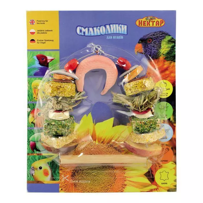 Великі смаколики для птахів №4 - це ласощі + іграшка, чудове поєднання гарного смаку, сучасних технологій та тепла людських рук. Пташки гратимуться як до поїдання смачних делікатесів так і після. Виріб містить зернові крекери різних смаків, сублімовані овочі та фрукти, шматочки шкіри та дерева. Доповненням до багатого складу є формований природній мінерал - джерело мікро та макро елементів для здорового росту та розвитку організму птаха.
