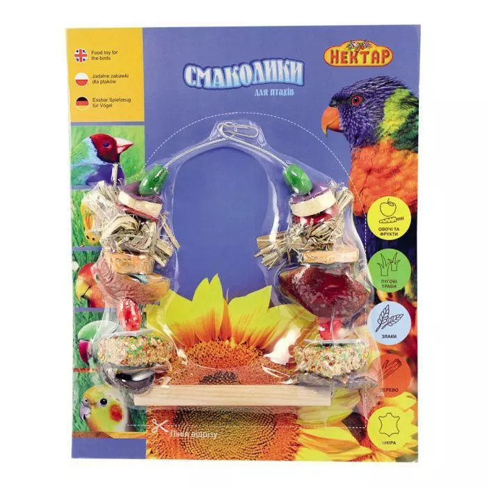 Великі смаколики для птахів №4 - це ласощі + іграшка, чудове поєднання гарного смаку, сучасних технологій та тепла людських рук. Пташки гратимуться як до поїдання смачних делікатесів так і після. Виріб містить зернові крекери різних смаків, сублімовані овочі та фрукти, шматочки шкіри та дерева. Вітамінізований гранулят, що входить до складу крекерів забезпечить пернатих збалансованим комплексом необхідних елементів.