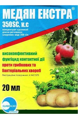«Медян Екстра» - високоефективний контактної дії проти широкого спектру збудників грибкових і бактеріальних захворювань, застосовується в якості профілактичного, бактерицидного і дезинфікуючого засобу. Завдяки високій ефективності препарат починає діяти одразу після обробки, утворюючи захисний шар на поверхні обробленого рослини.Форма випуску препарату: концентрат суспензії