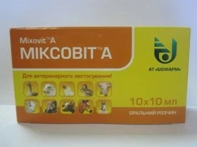 Міксовіт А, 10 мл. Комплекс жиророзчинних та водорозчинних вітамінів. Препарат для профілактики та лікування дефіциту жиророзчинних та водорозчинних вітамінів, підвищення загальної резистентності організму, стимуляції обміну речовин, зменшення негативного впливу стресів під час транспортування, вакцинації, зміни раціону тощо, а також з метою прискорення зростання при відгодівлі. Покращує показники конверсії корму з допомогою підвищення засвоєння кормів, стимуляції процесів травлення.Склад