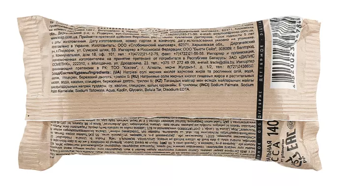 Натрієві солі жирних кислот харчових жирів і рослинних олій, вода, гліцерин, каолін, березовий дьоготь, трилон Б та ін.