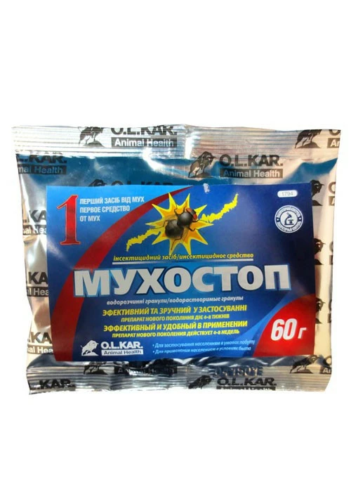 Приготування робочого розчину: у ємності апарату для обприскування розчинити 400 г препарату Мухостоп у 3,2 л прохолодної води, ретельно розмішати.