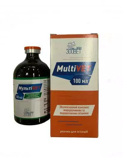 Фармакологічні властивості: "МультиВет" (Tetravit) - це збалансований комплекс жиророзчинних і водорозчинних вітамінів у фізіологічно оптимальному співвідношенні. Препарат сприяє нормалізації обміну речовин в організмі тварин і птиці, підвищує резистентність організму, запобігає гіпо-іавітамінозу та захворюванням, які розвиваються на цьому тлі, підвищуєпродуктивність тварин і птиці. Вітаміни є складовими частинами ферментних груп, що беруть участь в обміні вуглеводів, білків і жирів, вони активізують ферментативну, гормональну та імунну системи тварин і птиці та необхідні для забезпечення нормального функціонування організму. Вітамін А сприяє зростанню та регенерації клітин різних тканин, активізує функціонування печінки, шкіри та сітківки ока. Вітамін Д3 впливає на засвоєння та регулювання обміну кальцію та фосфору, необхідних для зростання та збереження структури кісток. Вітамін Е - біологічний антиоксидант, який захищає клітини від пошкодження вільними радикалами, бере участь у жировому обміні, формуванні клітинних мембран, зміцнює стінки кровоносних судин, а також забезпечує клітинне дихання, підвищує загальну опірність організму, стимулює репродуктивну функцію тварин.