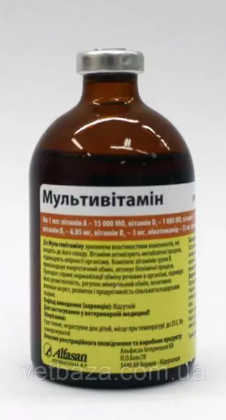 Мультивітамін 100 мл (Альфасан) - являє собою розчин для ін'єкцій, до складу якого входять жиро-і водорозчинні вітаміни, розчинник – вода для ін'єкцій та емульгатор.Склад