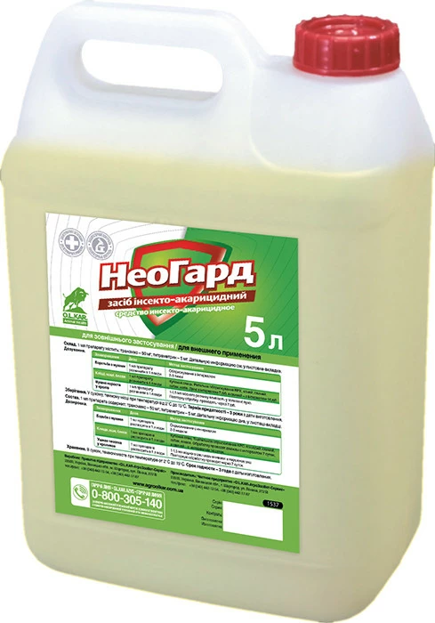 Неогард діє специфічно, як нейротоксин тільки на нервові синапси у комах і практично не впливає на обмін речовин у теплокровних тварин. Згубно активний проти саркоптоїдних, іксодових, демодекозних кліщів, вошей, бліх, волосоїдів, мух. Препарат відноситься до групи малотоксичних для теплокровних тварин сполук, у рекомендованих дозах не чинить місцево-подразнюючої та сенсибілізуючої дії. Токсичний для риб і бджіл.