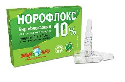 Норофлокс 10% оральний антибіотик. Діюча речовина енрофлоксацин. Застосовують для лікування колібактеріозу, сальмонельозу, некротичного ентериту, стрептококозу, гемофільозу, кампілобактерійного гепатиту, мікоплазмозу, а також змішаних інфекцій птиці. Дозування 1мл на 1 л.води 3-5 днів підряд.Оплата та доставка
