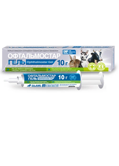 1. При телязіозі великої рогатої худоби голову тварини фіксують оком доверху і за допомогою шприца-туби повільно вносять гель Офтальмостар у кон'юнктивальний мішок у дозі 0,8-1 мл, злегка масажуючи. Препарат застосовують протягом 3-4 діб, до повного видужування. При запаленні повік їх краї очищують від лусочок і за допомогою тампону змащують повіки гелем. При лікуванні інших офтальмологічних захворювань у ділянку внутрішнього кута ока вносять по 5-7 крапель препарату. Обробку проводять 4-7 разів з 12-годинним інтервалом. Якщо блефарит був спричинений кліщами, то курс лікування повторюють 2-3 рази через 10 діб незалежно від результатів першого курсу лікування.