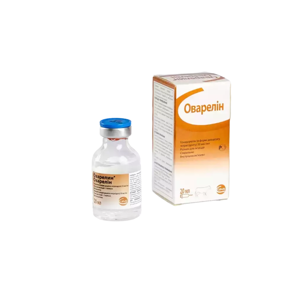 Опис Прозорий, безбарвний розчин для ін’єкцій. Склад 100 мл препарату містить діючу речовину: гонадорелін (у формі диацетату тетрагідрату) 0,005 г Допоміжні речовини: бензиловий спирт, дигідрофосфат калію, дикалійфосфат, натрій хлористий, вода для ін’єкцій q.s. 100 мл. Фармакологічні властивості АТС vet класифікаційний код QH01CA01 – гонадотропін-рилізинг-гормони. Гонадорелін є синтетичним гормоном фізіологічно і хімічно ідентичним гонадотропін-рилізинг гормону (GnRH), що синтезується у ссавців. Гонадорелін стимулює синтез і вивільнення гонадотропінів гіпофізом, лютеїнізуючого гормону (ЛГ) та фолікулостимулюючого гормону (ФСГ). Зв'язування GnRH активує синтез каскадів протеїнкінази С (РКС), а також мітоген-активованої протеїнкінази (МАРК), які забезпечують важливий зв'язок для передачі сигналів від поверхні клітини до ядра в процесі синтезу гонадотропінів. Після внутрішньом'язового введення 100 мкг гонадореліну (в формі диацетату тетрагідрату) максимальну концентрацію (Cmax) 120,0 ± 34,2 нг/л спостерігають впродовж 15 хв (Tmax). Абсолютна біодоступність гонадореліну, за оцінками, складає близько 89%. Гонадорелін є природним пептидом, який швидко руйнується до неактивних метаболітів. Після внутрішньом'язового введення гонадореліну корові, він в основному виводиться разом з молоком, сечею і фекаліями. Високий відсоток від введеної дози виводиться у вигляді вуглекислого газу з видихуваним повітрям. Застосування Оварелін застосовують коровам для: лікування затримки овуляції; лікування фолікулярних кіст; синхронізації тічки у корів. Дозування Препарат вводять одноразово внутрішньом’язово у дозі 2 мл на одну тварину (що відповідає 100 мкг гонадореліну) через 4-10 годин після виявлення статевої охоти (еструсу). Штучне осіменіння корів та фізіологічно зрілих теличок проводять через 12-24 годин після виявлення статевої охоти (еструсу), але не раніше ніж через 2 години після введення препарату. Протипоказання Не встановлені. Застереження Відсутні. Форма випуску Скляні флакони по 4, 10, 20, 50 мл в картонних коробках. ЗберіганняЗберігати в сухому захищеному від світла місці за температури 0 - + 25 С. Термін придатності - два роки.